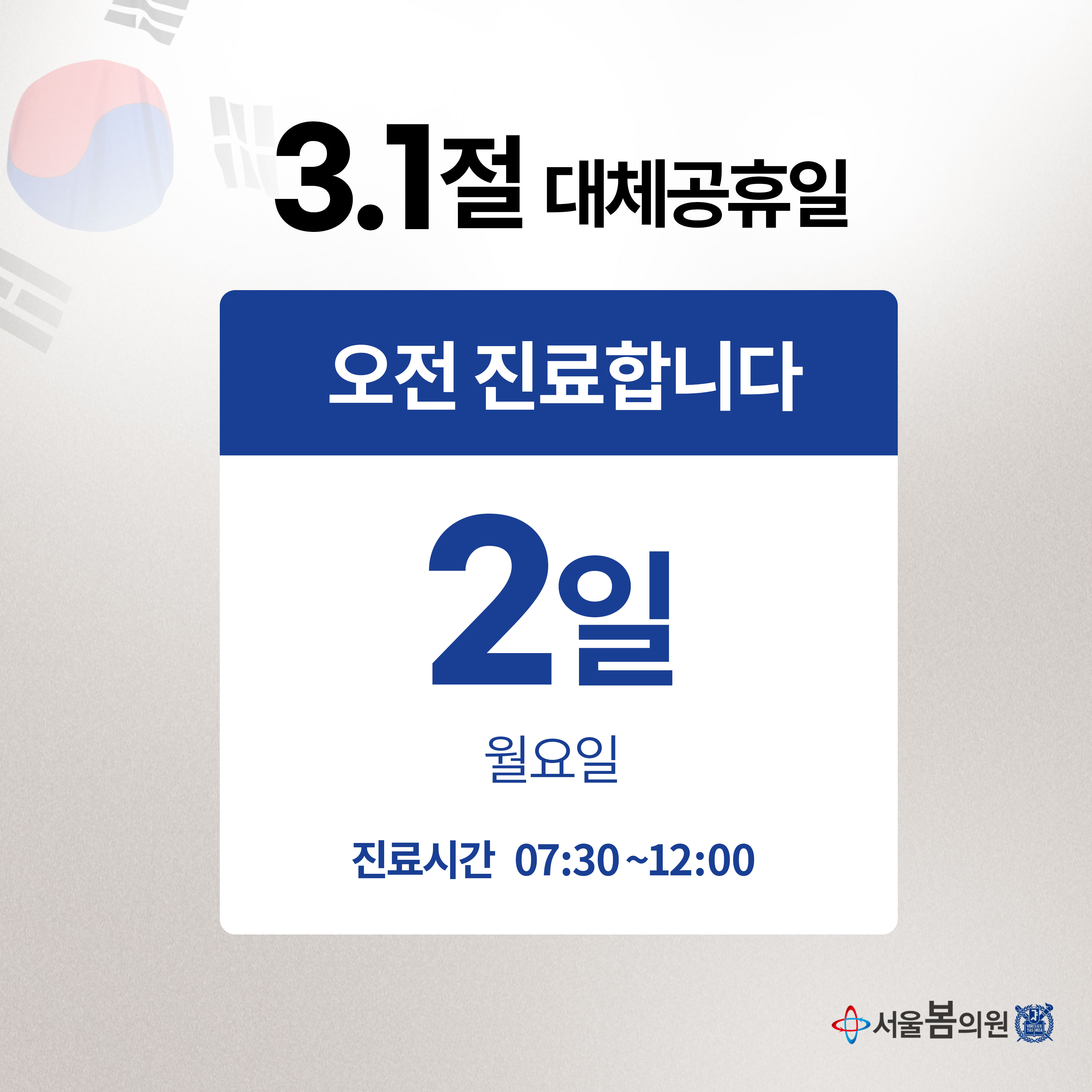 ´ëÀü ¼¿ïº½ÀÇ¿ø 3.1Àý ´ëü°øÈÞÀÏ¿¡ ¿ÀÀüÁø·áÇÕ´Ï´Ù.